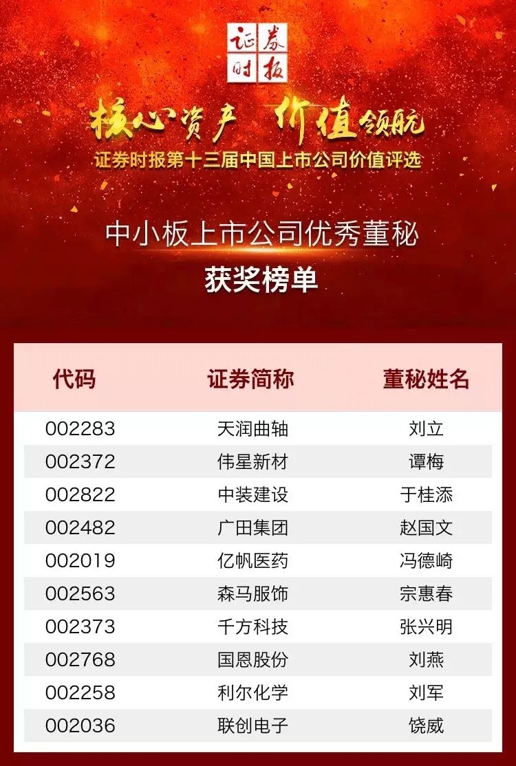 ±¾´ÎÂÛ̳ͬʱʢ´ó½ÒÏþÁË¡°µÚÊ®Èý½ìÖйúÉÏÊй«Ë¾¼ÛÖµÆÀÑ¡¡±¸÷½±Ïî°ñµ¥£¬ÎÒ¹«Ë¾¶Ê»áÃØÊéÁõÁ¢Å®Ê¿ÈÙ»ñ¡°ÖÐС°åÉÏÊй«Ë¾ÓÅÒì¶Ãؽ±¡±£¬×èÖ¹ÏÖÔÚ£¬ÁõÁ¢Å®Ê¿ÒÑÒ»Á¬Á½Äê»ñµÃ´Ë½±Ïî¡£